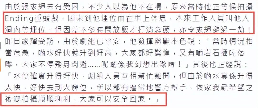 而张家辉当天的确有拍摄任务,工作人员还叫他先进山洞等着。只不过,当时已经快到饭点了,张家辉就没有提前过去,而是在车里休息,等着吃饭,所以才逃过一劫。