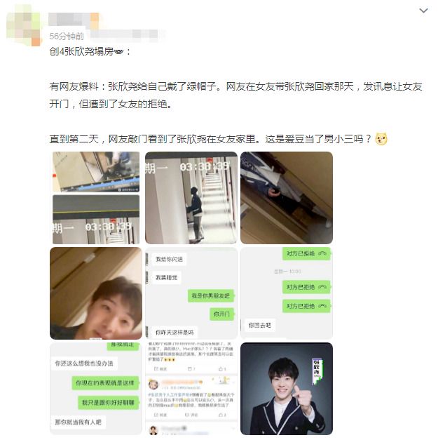 第二天早上,网友敲门进去捉奸刚好和张欣尧正面相遇,随即拍下张欣尧的照片发到了社交平台上,这才确定张欣尧做了两人感情的小三。