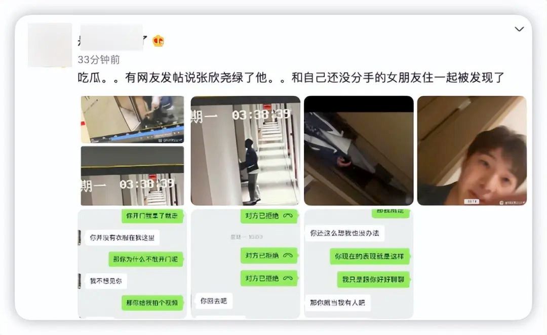 11月2日,有一位匿名网友爆料,他点名爆料,称一个明星男爱豆张欣尧插足自己跟女友的感情。跟其他空口爆料的人不同,他不仅晒出了当天的监控视频,还晒出了跟女友的聊天记录证明自己确实是在恋爱期间,可谓证据充足。