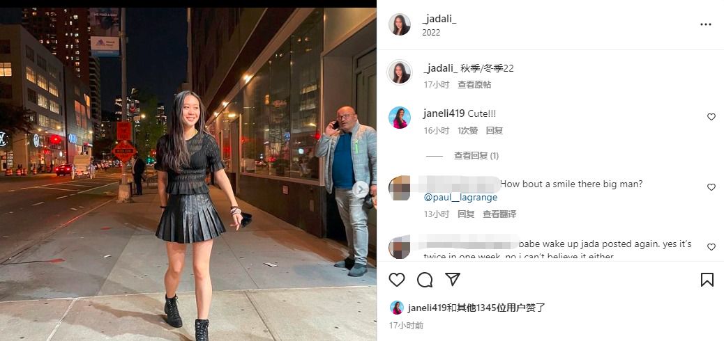 曝光的照片中,19岁的Jada站在街头打扮得非常大胆,上身穿着黑色透视装,下身搭配超短百褶裙,露出一双又细又白的美腿,火辣的好身材也一览无余。其出众的外貌吸引了身旁外国大叔的目光,对方打着电话还目不转睛地望着Jada。引人注目的是,周围人都穿着厚实的羽绒服,与Jada清凉的穿着打扮仿佛在过两个季节。